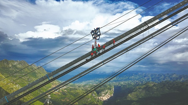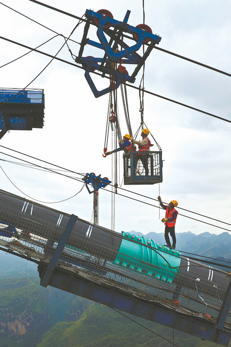 Workers operate on the Huajiang Grand Canyon Bridge in Guizhou province on Sept 11, 2024. LEI SHENG/FOR CHINA DAILY