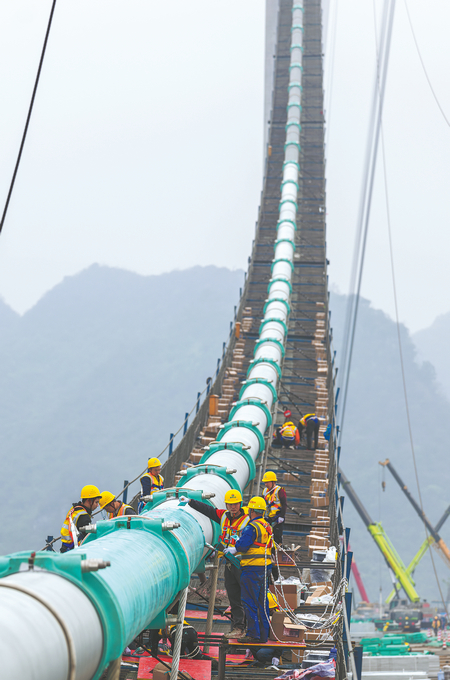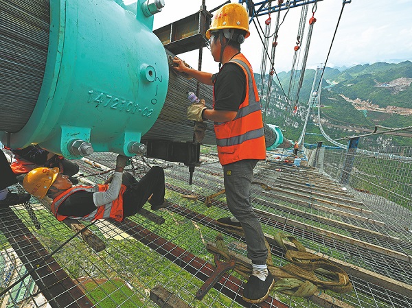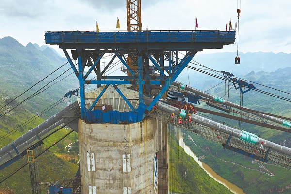 The bridge is a key project on the expressway that links the Liuzhi special district of Guizhou's Liupanshui city and Anlong county of Qianxinan Bouyei and Miao autonomous prefecture in Guizhou.