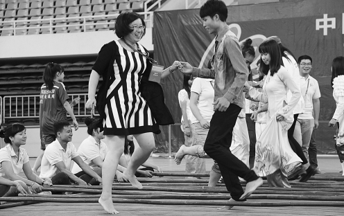 Students from Thailand, Vietnam, Laos and Cambodia take part in a sports event featuring traditional bamboo dancing at Guizhou University in Guizhou province on Sept 2.[Provide To China Daily] |